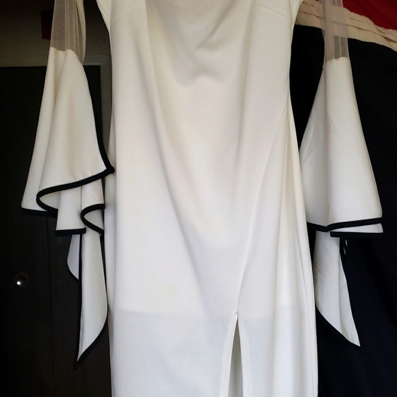 White, off the shoulders,sheer sleeves, black trim on the bell-arms. Worn once.
