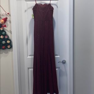 Beautiful burgandy/ red strapless long dress from windsor. Top of the dress is scalloped, form fitting then flares at the bottom. Size 5 but fits as a 4.