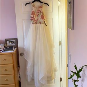 White layered prom dress with pink and green flowers at the top