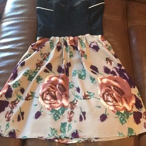 Strapless dress with hidden pockets. The dress is black on the top half with a white seam throughout the front right before the edge. The skirt part is a gray background with multiple colored flowers. The skirt is nice and flowing while the top area is more fitted. The tops back area has a small elastic band that goes up the middle of the back only.