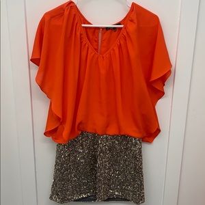 Orange top with flowing sides and bottom attached skirt is stretchy with gold sequins