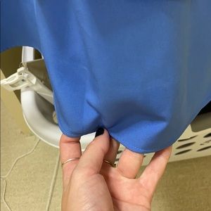 Cute blue high neck dress. Crosses in the back and has some cute layering at the bottom. Has been worn and has some deodorant stains and some spots at the bottom but can barely see them when it’s on.