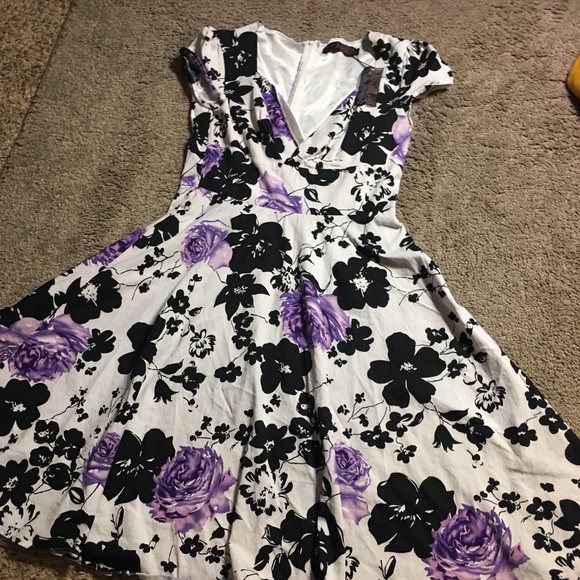 A white black and purple floral dress with a v neck