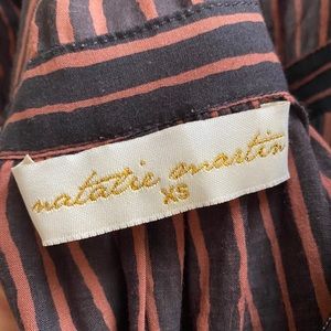Beautiful Natalie Martin kimono sleeved, above ankle length dress. Low V neck and back. Tie in back with tassel detail. Back zipper. Coco and muted coral stripes.