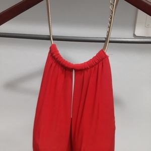 Red cocktail dress, slip on, peep hole front, halter with built in chain, breast padding, spandex, machine washable.