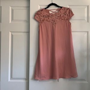 Light pink shirt dress with lace at the top and a criss cross back