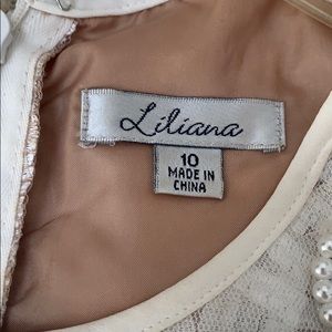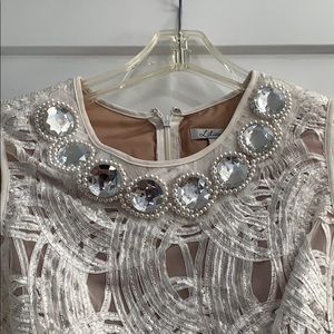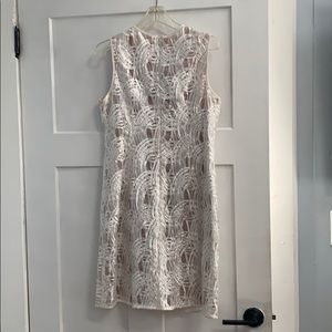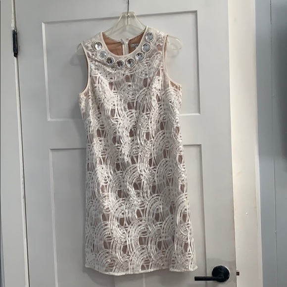 White with nude liner 100 % combo Liner 100% polyester Knee length Zipper down back Beading detail on collar Size 10 Perfect for parties, christening, brunch Only worn once