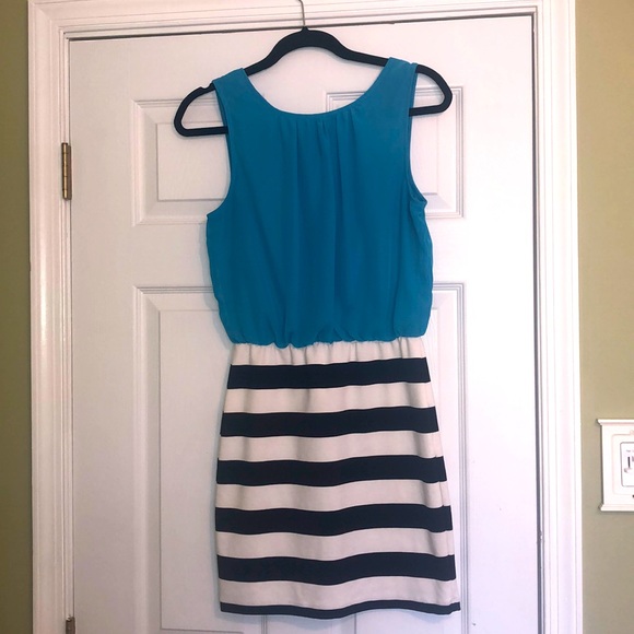 Ruby Rox sleeveless dress. Size medium. Blue top with black and white stripped bottom. Lots of stretch in the bottom part! Worn once. Comes from a smoke free and pet free home.