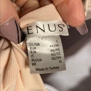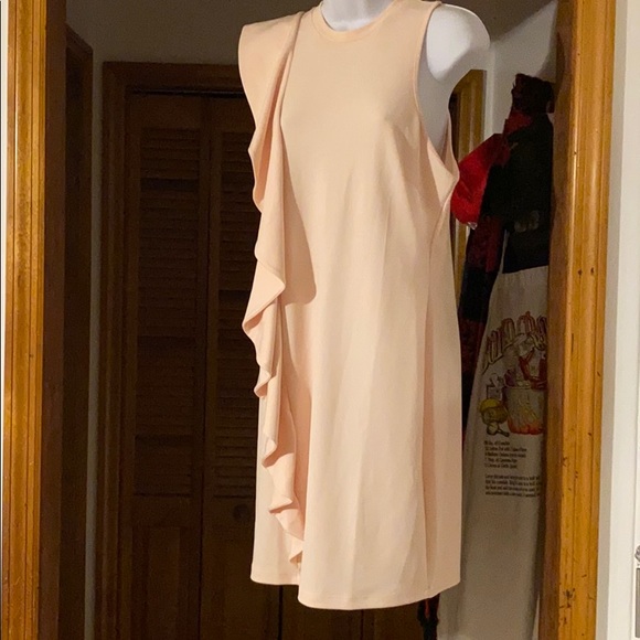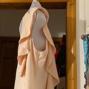 Soft cream pink ruffle down one aide to 1/2 back form fitting depends on size but should be just above knees never worn
