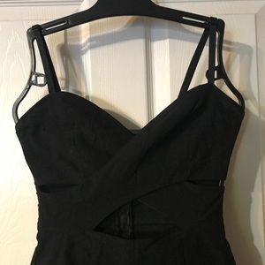 Cute black dress. Has openings under the breast and above stomach area. Wrap around breast area.