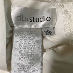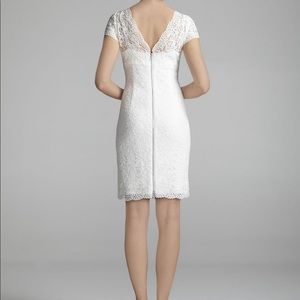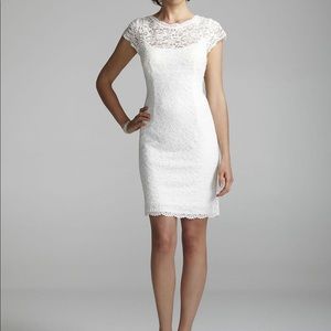 Beautiful David’s Bridal White/Ivory knee length dress with lace detail and built in slip. Great as a bridal dress, bridal shower, bachelorette dress, cocktail dress, church dress, Easter dress, family photos, engagement photos, etc. Only worn twice, no tears or stains. I am 5’3 and this hits just above my knees. 34.5” from neckline. Size 4
