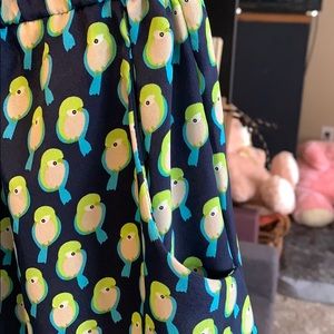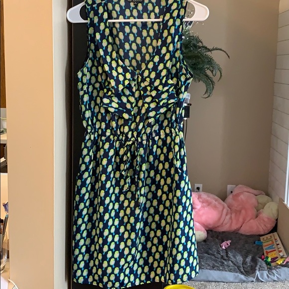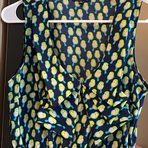 Sleeveless (tank top straps) dress with a small bird pattern on navy blue background. Dress has low v-neck with flap detail. Pockets. Cinched waist. Dress is on the shorter side—falls about halfway above knee. In very good condition—worn extremely infrequently.