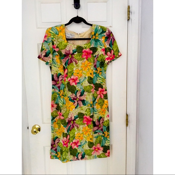Maggie London dress. Size 8. Multi floral silk print. Vibrant pink, green yellow & teal. Short sleeve w rounded neck.