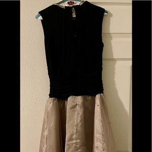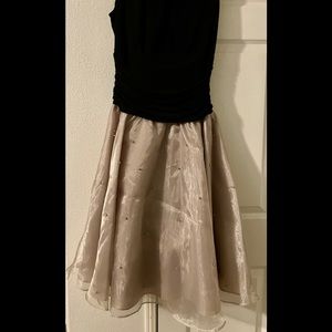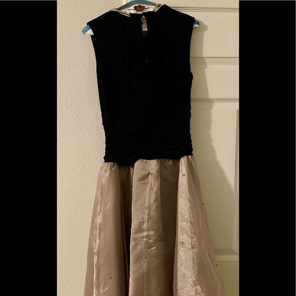 Need jewelry & a dress for your event? Here it is! Double pearl necklace attached to the dress. Black sleeveless stretchy top w/ ruching at the belly area (have dessert!) Bottom of the dress is sheer tan w/ sewed on pearls (none are missing or loose) crinoline only at the bottom 6 inches under the dress. No flaws, stains or tears. From a non-smoking home.