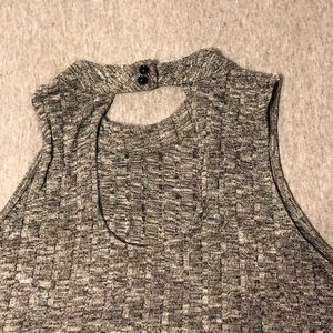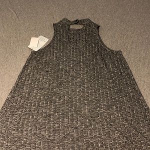 NEW with Tags!! Gray sleeveless dress with a halter style neck. Very fun and funky knee length dress with a 2 button closure at the back of the neck. Reasonable offers always welcome.