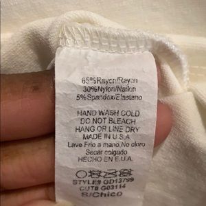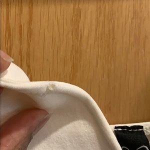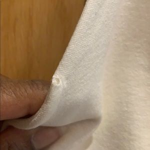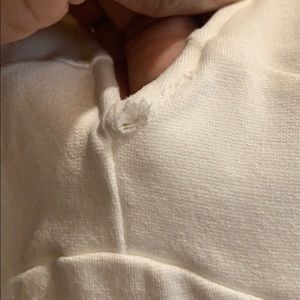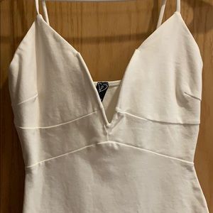 White tight fitting dress. Very small areas noted in pictures from tears while in washing machine, can barely see them. Super cute dress!