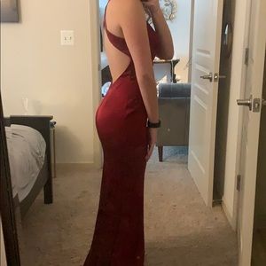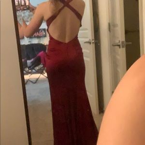 A lovely red satin dress low in the font with an open back except for the criss cross of the straps towards to top of the back.