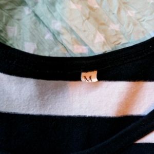 Long dress with black and white strips along with one pink strip