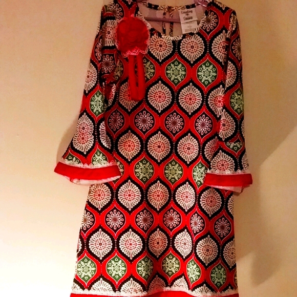 Girl's Casual Christmas Dress; Bell Sleeves; Vibrant Christmas Colors; Dress is new, it was never worn due to wrong size for my daughter, tags and receipt were lost and was not able to return to Belk Store. This dress is absolutely Gorgeous!