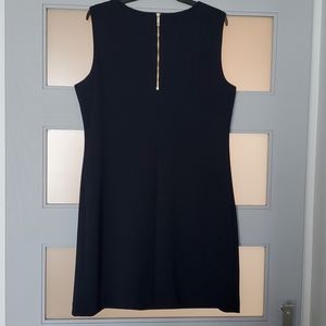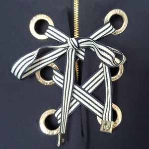 Navy blue has gold loops that navy and white ribbon tie through. Gold zipper down the back. Like new only wore once. Comes from a smoke and pet free home.