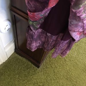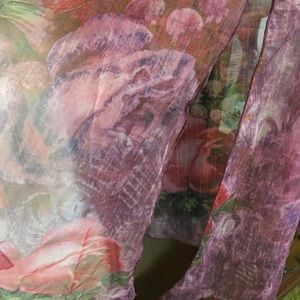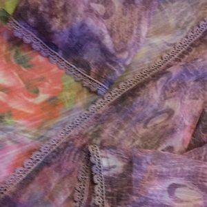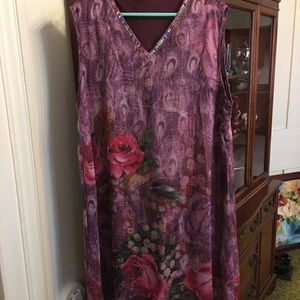 Gauzy purple and white sleeveless dress with big pink flowers. V-neck bling outline accent. Shift is lined with solid purple material. Very gauzy short sleeved shell with side slits top off the outfit. Shell also has purple faux tatting around front, neck and sleeves. Hand wash or delicate cycle. No tags but I’d guess polyester. Tiny size tag says 5x no way! Either 2x or 3x Never worn