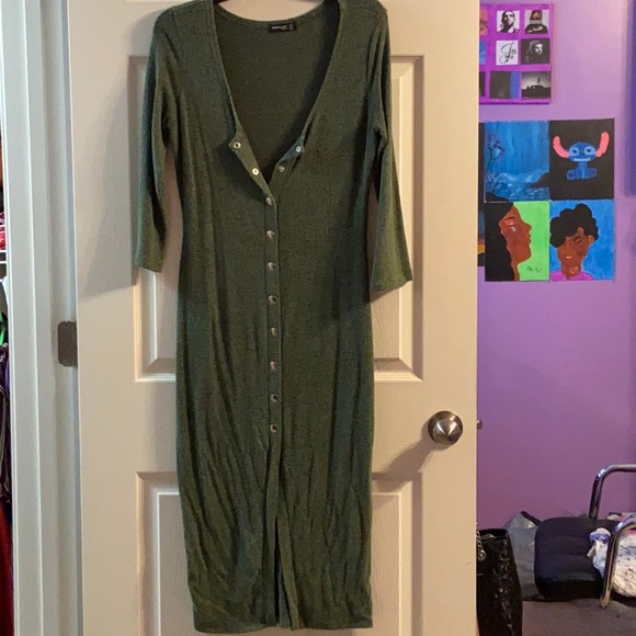 This is a used dress and this is also perfect for running quick errands in it is not that snug on the body loose fitting. Has buttons