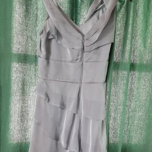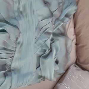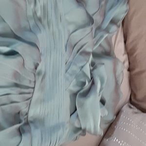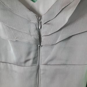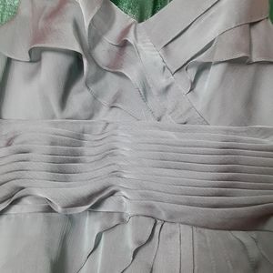 Sleeveless dress with v neck and Ruffles down the front with a zipper back closure and gathered at the waist. It is light teal color even though it looks gray in the pic. Last 2 pics show the color better.