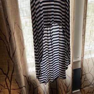 High low dress. Stripe detail. Front length from top of strap to bottom is 37”. Back length from top of strap to bottom is 58”. Super stretchy light fabric! Size large. 95%rayon, 5%spandex. Comes in at waste to show off figure in a flattering way!