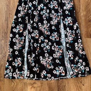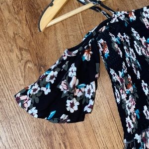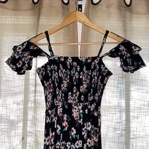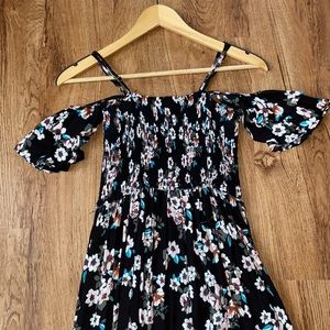 Cold shoulder floral dress. Size medium. Cute ruffle cold shoulder sleeves! Straps are adjustable for perfect fit! Super stretchy comfy fabric! Length from top of strap to bottom of dress is 49”.
