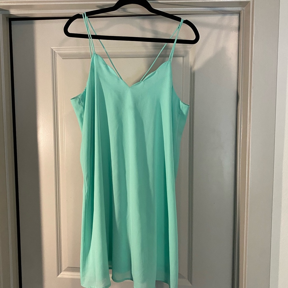 Light teal shorter dress with scalloped neck like and fun strap design. Never worn!
