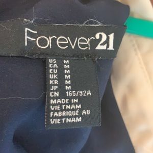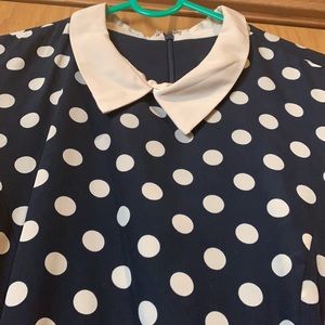 Sleeveless blue and off white polka dot dress with collar, pleated skirt, lining and invisible zipper in the back for closure. Size M