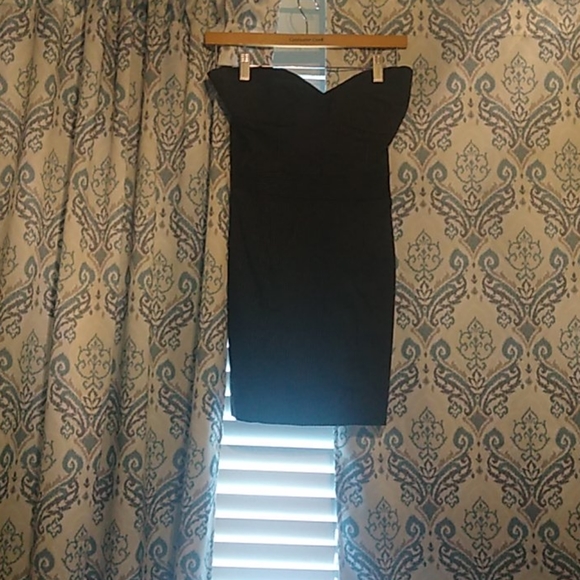 Strapless Black and white striped. It has cups sewn in and no slip to hold up.