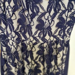 Navy blue lace bodice with tan lining, back zip and hook and eye closure, sleeveless dress. Beautiful dress, worn once