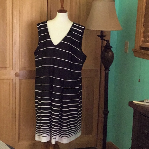Black sleeveless dress with descending white horizontal stripes small to large. Zips in the back. Very comfortable.
