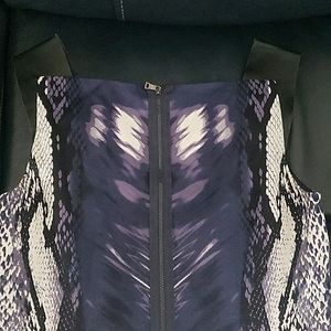 Navy animal print dress with wide leather shoulder straps. Dress is in slightly stretch fabric with dark center panel to give slim look.