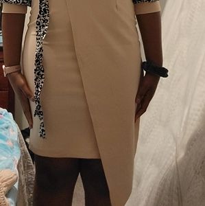 Salmon pink dress with cheetah print sleeves and belt.