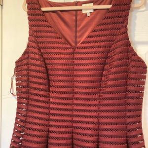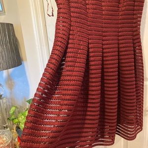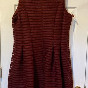 This dress is fitted in the bodice and flares at the waist. Very flattering to any figure and hides flaws. V- neckline and hidden back zipper. Color is rich wine. Dress up for prom, luncheon, dinner.