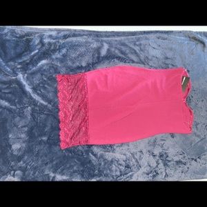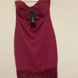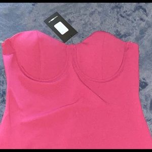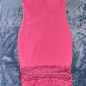 Bodycon dress. Padded bra area with wire The color is magenta. (Very dark pink)Fit more like a large if you don’t want it too tight. But will fit a curvy girl. Very stretchy spandex material. Not see through. Lace details on the bottom of the dress no zippers. Slip on style