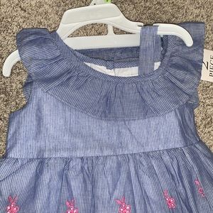 Pinstripe blue/white dress with pink floral embellishments. Matching bottoms to cover diaper. NWT