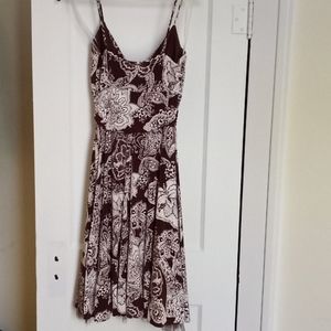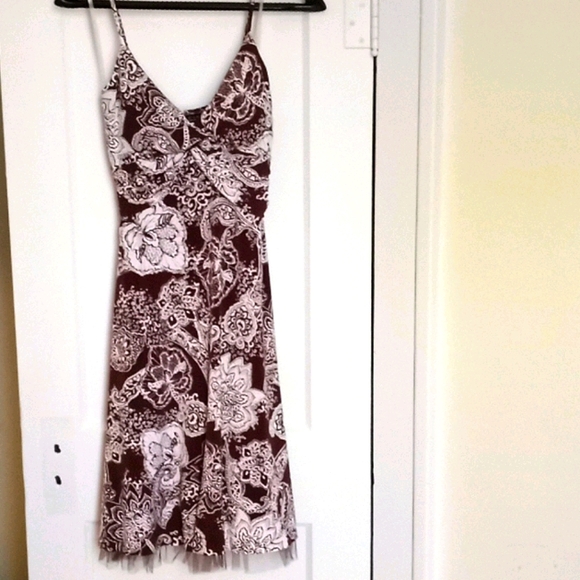 Brown and white floral print knee length dress. Spaghetti straps and small amount of tulle on the bottom. Excellent condition.