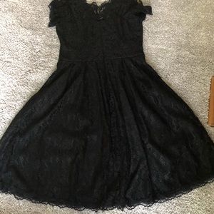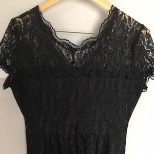 Black lace dress, sheer shoulders, lace cap sleeve, button detail on the front, zipper back, hits just above the knee. Worn one time for an event. Lined