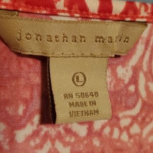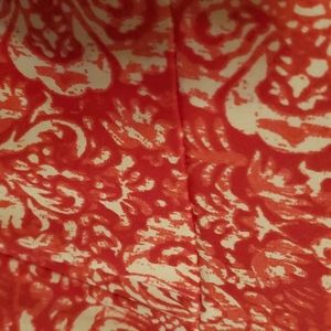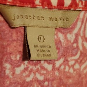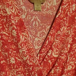 It is a vibrant hot Pink and red dress. It has white designs throughout the dress. It is a lightweight,sleeveless dress. The top front area overlaps to show less cleavage. Beautifully designed. Can be worn Casually or Business styled dress. Bottom of dress has a little flare. I hope you enjoy this dress.