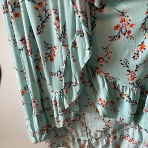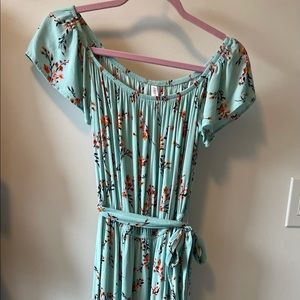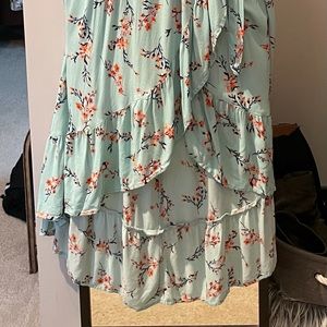 Beautiful SunDress- long in back, short in front, blue with orange flowers, can be worn off the shoulder. Excellent condition from a smoke free home.