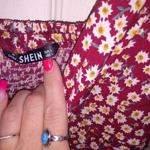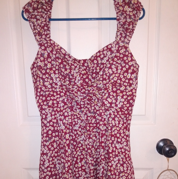 Above the knee flowy summer dress with capped sleeves. Color is more of a maroon, with small floral print. Brand new, tried on once and was too large.