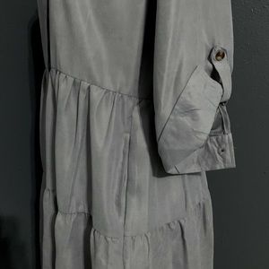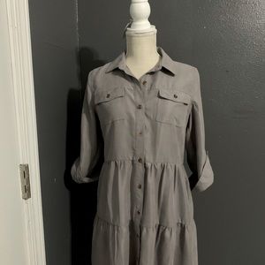 Gray button down dress with front pockets. Nice casual dress, which can be worn as a shirt with leggings. The sleeves are cuffed at elbow length.
