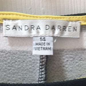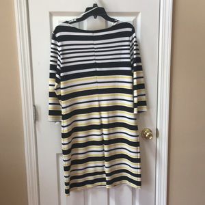 Black and yellow stripes on white background polyester dress with 3/4 length sleeves with zipper accents. Measures 20 in armpit to armpit aged 45 in from shoulder to hem.