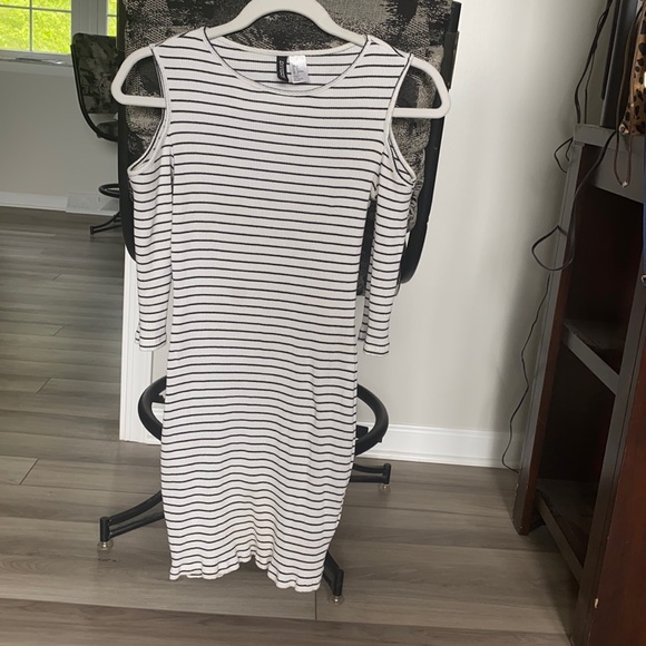 Quartered length sleeve dress with open shoulders Very light stain (pictured) Dress is size 6 stretchy material