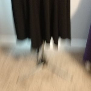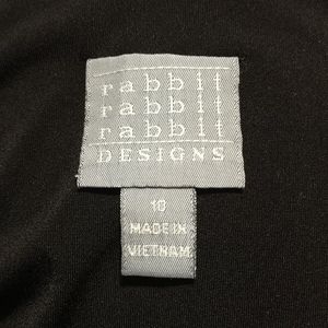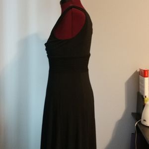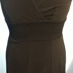 Sleeveless black dress with ruching detail in middle and a hankerchief hemline. No zippers. Pull on.