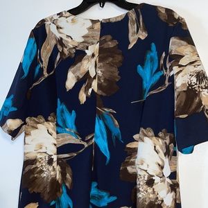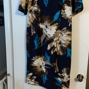 BNWOT Liz Claiborne flower pattern dress in navy, teal, brown, and cream. Knee length. Polyester/Spandex. Super flattering on!