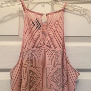 This dress is a light pink and is a longer length. It is very dressy. There are no tags on the dress, but it has never been worn.